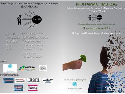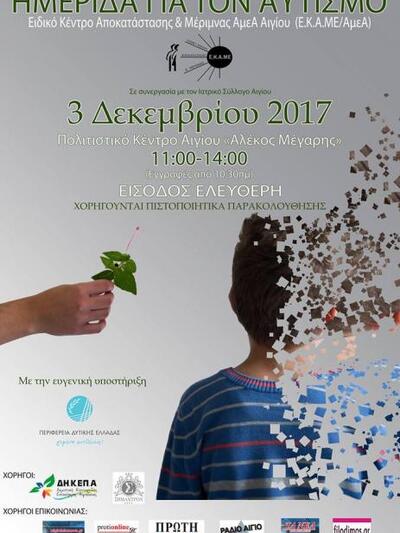Εξάλλου, η Περιφέρεια Δυτικής Ελλάδας σε συνεργασία με το Ειδικό Κέντρο Αποκατάστασης & Μέριμνας Ατόμων με Αναπηρίες Αιγίου (Ε.Κ.Α.ΜΕ./ΑμεΑ) και τον Ιατρικό Σύλλογο Αιγίου διοργανώνει Ημερίδα με κεντρικό θέμα τον Αυτισμό στις 3 Δεκεμβρίου 2017 (Παγκόσμια Ημέρα Ατόμων με Αναπηρίες) και ώρα 11:00πμ στο Πολιτιστικό Κέντρο «Αλέκος Μέγαρης»(Κανελλοπούλου 10) στο Αίγιο.