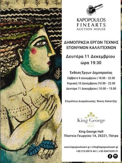 Η γκαλερί Kapopoulos Fine Arts μας προσκαλεί στην Δημοπρασία Έργων Τέχνης ξένων και Ελλήνων καλλιτεχνών που θα γίνει για πρώτη φορά στην Πάτρα, στον πολυχώρο εκδηλώσεων "King George Hall" στην πλατεία Βασ. Γεωργίου Α΄την Δευτέρα 11 Δεκεμβρίου.