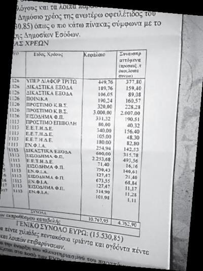Οπως εξήγησε η Ζ.Μ., το χρέος της στην εφορία είναι 10.000 ευρώ και οι τόκοι 5.000, ενώ ποσό =2.000 ευρώ έχει χρεωθεί από λάθος της εφορίας, το οποίο δεν έχει αποκατασταθεί και δεν έχει σβηστεί.
