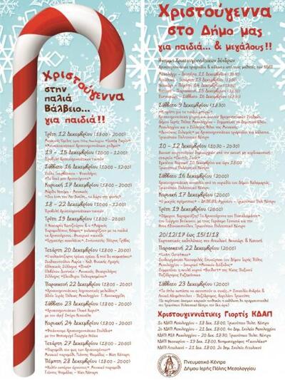 Τα «Χριστούγεννα στο Δήμο μας για παιδιά…& μεγάλους» περιλαμβάνουν γιορτινές εκδηλώσεις σε όλα τα δημοτικά διαμερίσματα, μουσικές εκδηλώσεις αλλά και αφιέρωμα στην παλιά Βάλβειο με λογοτεχνικές συναντήσεις πλαισιωμένες από εορταστικές μελωδίες, αλλά και προβολές ταινιών.