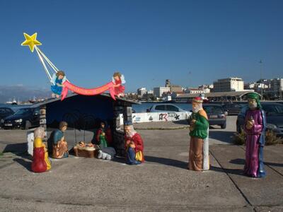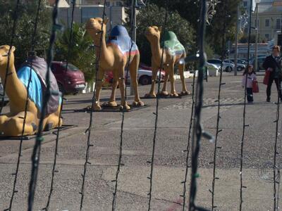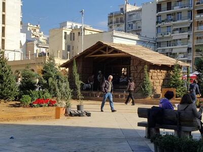 Στην πλατεία Γεωργίου οι εργασίες συνεχίζονται αλλά ήδη η φάτνη που έχει φτιαχτεί κεντρίζει τα βλέμματα των περαστικών, χάρη στην εντυπωσιακή κατασκευή της, η οποία έχει την καλλιτεχνική υπογραφή του Πέτρου Βρυώνη.