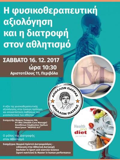 Ο Απόλλων Πάτρας διοργανώνει εκδήλωση με θέμα: «Η φυσικοθεραπευτική αξιολόγηση και η διατροφή στην αθλητισμό». Η εκδήλωση θα πραγματοποιηθεί το Σάββατο 16 Δεκεμβρίου 2017, και ώρα 10:30 π.μ.