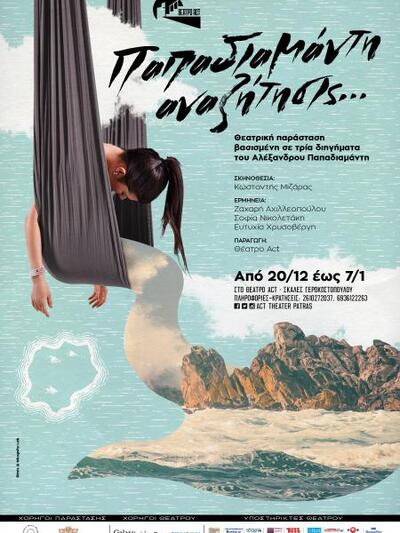 Το θέατρο act στις σκάλες Γεροκωστοπούλου, στην Πάτρα θα παρουσιάσει τη νέα του γιορτινή παραγωγή. Μια ζεστή θεατρική παράσταση με τίτλο «Παπαδιαμάντη αναζήτησις», γεμάτη με τη υπέροχη γλώσσα και το περιβάλλον του μεγάλου διηγηματογράφου Αλέξανδρου Παπαδιαμάντη: