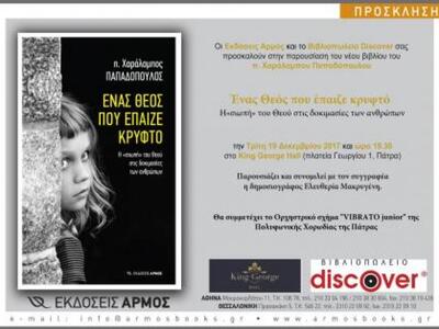 Το βιβλιοπωλείο Discover και οι εκδόσεις "Αρμός" συνδιοργανώνουν την εκδήλωση παρουσίασης του νέο βιβλίο του π. Χαράλαμπου Παπαδόπουλου με τίτλο «Ένας Θεός που έπαιζε κρυφτό – Η «σιωπή» του θεού στις δοκιμασίες των ανθρώπων» που θα πραγματοποιηθεί την Τρίτη 19 Δεκεμβρίου στις 19:30, στο King George Hall, στο κάτω μέρος της πλατείας Γεωργίου Α’.