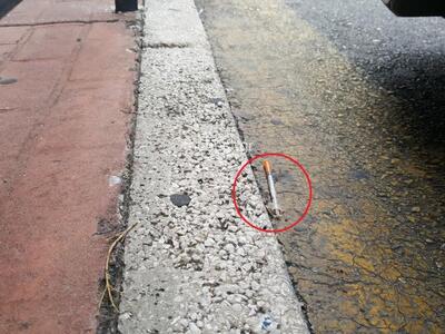 Ο υπάλληλος του τομέα πρασίνου αφού εντόπισε την σύρριγγα την πέταξε στο οδόστρωμα - φωτο άρθρου - και στη συνέχεια ενημέρωσε τους συναδέλφους του για να του εξηγήσουν πως πρέπει να αντιμετωπίζονται τέτοια απορρίμματα.