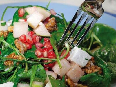 .Σαλάτα με Ελληνικά τυριά,ρόκα,ρόδι,Ελληνικά αλλαντικά και βινεγκρέτ μπαλσάμικου με μέλι,μουστάρδα και πορτοκάλι -------------------