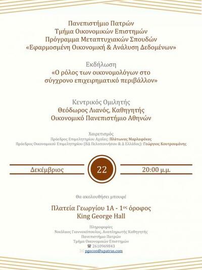 Το Πρόγραμμα Μεταπτυχιακών Σπουδών «Εφαρμοσμένη Οικονομική & Ανάλυση Δεδομένων» του Τμήματος Οικονομικών Επιστημών του Πανεπιστημίου Πατρών πραγματοποιεί εκδήλωση με θέμα: «Ο ρόλος των οικονομολόγων στο σύγχρονο επιχειρηματικό περιβάλλον». Η εκδήλωση θα πραγματοποιηθεί την Παρασκευή, 22 Δεκεμβρίου 2017, ώρα 20:00, στο χώρο εκδηλώσεων King George Hall, Πλατεία Γεωργίου 1Α, 1ος όροφος, Πάτρα.