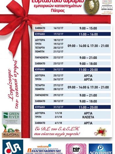 Ανοικτά μέχρι μέχρι τις 9 το βράδυ, συνεχόμενα, θα είναι σήμερα τα καταστήματα στην Πάτρα. Σύμφωνα με το προτεινόμενο ωράριο του Εμπορικού Συλλόγου Πατρών το Σάββατο 23 Δεκεμβρίου τα καταστήματα θα λειτουργήσουν από τις 9 το πρωί ως τις 6 το απόγευμα και την παραμονή των Χριστουγέννων από τις 11 το πρωί ως τις 8 το βράδυ.