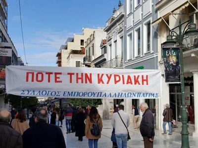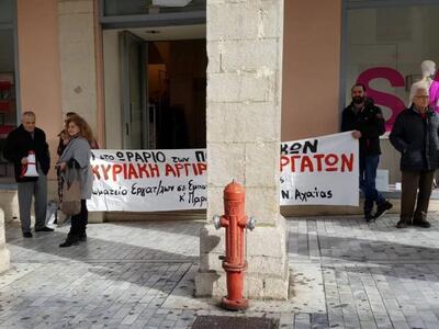 Απεργία αναμένεται να κάνουν οι εμποροϋπάλληλο. Το Εργατοϋπαλληλικό Κέντρο Πάτρας σε ανακοίνωσή του αναφέρει ότι "συμπαρίσταται και στηρίζει τον αγώνα των εμποροϋπαλλήλων και ιδιωτικών υπαλλήλων που απεργούν την Κυριακή 14 Γενάρη. Οι εμποροϋπάλληλοι συνεχίζουν τον αγώνα και την αντίστασή τους στους μνημονιακούς νόμους. Το εργατοϋπαλληλικό κέντρο Πάτρας μαζί με τους εργαζόμενους εναντιώνεται στην μνημονιακή ζούγκλα που καταστρέφει την ζωή των εργαζομένων στον κλάδο διαλύοντας τις εργασιακές σχέσεις και διευρύνοντας την εκμετάλλευση.