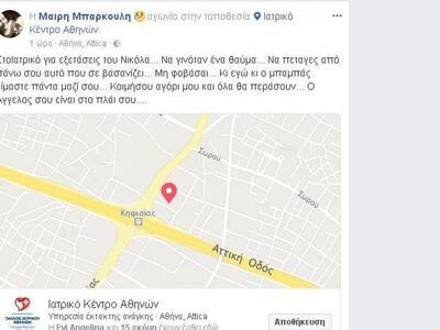 «Στο Ιατρικό για εξετάσεις του Νικόλα… Να γινόταν ένα θαύμα… Να πέταγες από πάνω σου αυτό που σε βασανίζει… Μη φοβάσαι… Κι εγώ κι ο μπαμπάς είμαστε πάντα μαζί σου… Κοιμήσου αγόρι μου και όλα θα περάσουν… Ο Άγγελος σου είναι στο πλάι σου…»