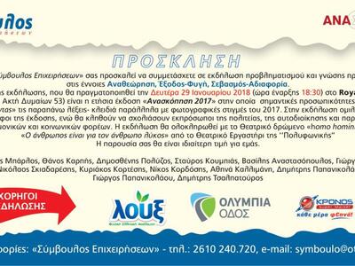 Στην εκδήλωση θα παρουσιαστεί η ετήσια έκδοση «Ανασκόπηση 2017» όπου σημαντικές προσωπικότητες αρθρογραφούν «ζωντανεύοντας» τις λέξεις – κλειδιά, Αναθεώρηση, Έξοδος-Φυγή, Σεβασμός-Αδιαφορία.