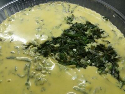 Αραιώνουμε το κουρκούτι μας με 3-4 κουταλιές νερό, έτσι ώστε να είναι αρκετά ρευστό και το ρίχνουμε επάνω στα χόρτα μέχρι να καλυφθούν εντελώς.