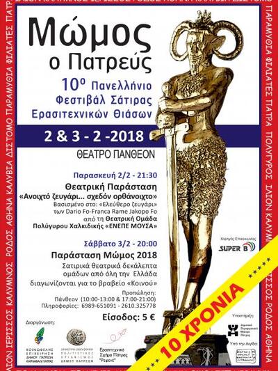 Στην τελική ευθεία εισέρχονται οι προετοιμασίες για το Πανελλήνιο Φεστιβάλ Σάτιρας Ερασιτεχνικών Θιάσων «Μώμος ο Πατρεύς», που φέτος φτάνει την 10η συνεχή χρονιά διεξαγωγής του και θα πραγματοποιηθεί την Παρασκευή 2 και το Σάββατο 3 Φεβρουαρίου στο Πάνθεον. Όπως αναφέρει η σχετική ανακοίνωση: