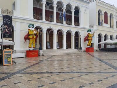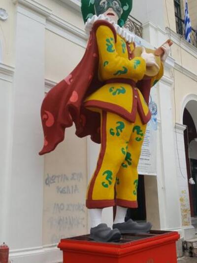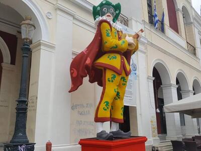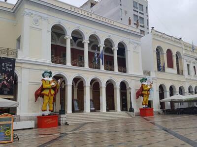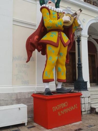 Δύο τεράστιες καρναβαλικές φιγούρες τοποθετήθηκαν μπροστά από το Δημοτικό Θέατρο Απόλλων της Πάτρας. Μάλιστα βρίσκονται ακριβώς μπροστά από τα συνθήματα στην πρόσοψη του.