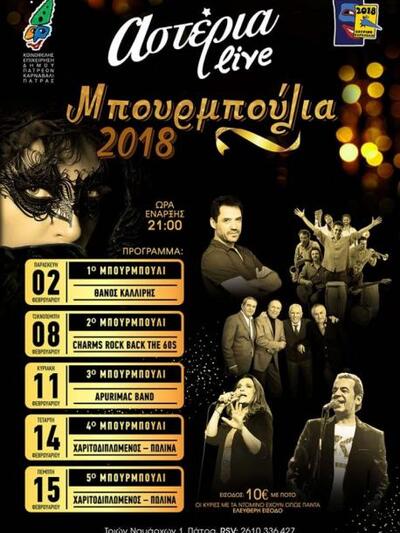Τέλος στα φετινά Μπουρμπούλια του Δήμου Πατρέων στα Αστέρια (την Τσικνοπέμπτη στο 2ο Μπουρμπούλι θα εμφανιστούν οι Charms ενώ προηγήθηκε ο Θάνος Καλλίρης στο 1ο την Παρασκευή 2/2) θα έρθουν και οι Apurimac στις 11/2 και η Πωλίνα του «Πάμε για τρέλες στις Σευχέλες» & του «Θα κάνουμε πους απς» μαζί με τον Κώστα Χαριτοδιπλωμένο, ερμηνευτή και δημιουργό επιτυχιών όπως το «Ψηλές κοντές» και «Αγκαλίτσες και φιλάκια», οι οποίοι θα τραγουδήσουν στα 2 τελευταία Μπουρμπούλια στις 14 και 15 Φεβρουαρίου 2018. Η ώρα έναρξης είναι στις 21.00.