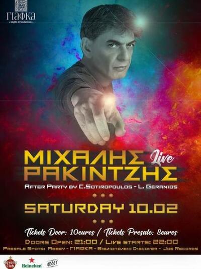 Το Σάββατο 10 Φεβρουαρίου στη Γιάφκα, κάτω από τα Ψηλαλώνια είδαμε ότι θα εμφανιστεί live ο Μιχάλης Ρακιντζής, εκ των κυριότερων εκπροσώπων της εγχώριας ποπ των δεκαετιών ’90 και 2000, ο οποίος μας είχε εκπροσωπήσει και στην Γιουροβίζιον το 2002 με το «S.A.G.A.P.O.». Θα ακολουθήσει after party με δύο γνωστούς dj.