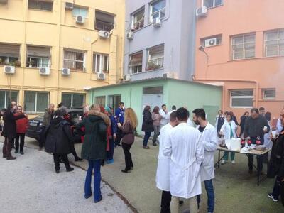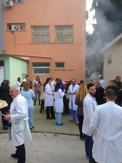 Ο προαύλιος χώρος του νοσοκομείου γέμισε... καπνούς και χαρούμενα πρόσωπα.