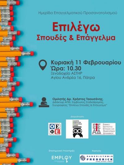 Ο Σύλλογος ιδιοκτητών Φροντιστηρίων Νοτιοδυτικής Ελλάδας, υπό την αιγίδα της Ο.Ε.Φ.Ε., διοργανώνει εκδήλωση Επαγγελματικού Προσανατολισμού με θέμα την Επιλογή Σπουδών και Επαγγέλματος. Η εκδήλωση θα πραγματοποιηθεί την Κυριακή 11 Φεβρουαρίου 2018, στο Ξενοδοχείο Αστήρ (ημιώροφος, Αγίου Ανδρέου 16), και η ώρα προσέλευσης είναι στις 10.30 π.μ.