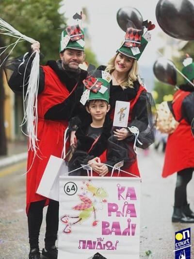 Mια από τις πιο προσεγμένες οικογενειακές παρέες της παρέλασης των Μικρών ήταν το πλήρωμα «Ασοι στο μανίκι» του On Court Rio Tennis Club, με στολές που επιμελήθηκαν η Αλεξία Παππά και η Εφη Σιαίνη, συνδημιουργοί του πατρινού fashion brand Maraboo. Στη διχρωμία κόκκινου-μαύρου και με ιδιαίτερο καπέλο με τραπουλόχορτα, ήταν από τα γκρουπ που ξεχώρισαν φέτος και μάλιστα γονείς και παιδιά κρατούσαν μαύρα μπαλόνια, τα οποία πάντα αρέσουν στο δρόμο. Ακολούθησε πολύωρο πάρτι στο W Events του Ρίου, που είχε μετατραπεί σε παιδότοπο.