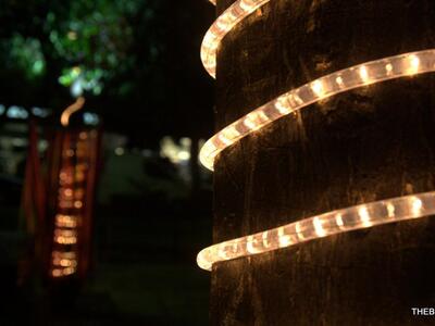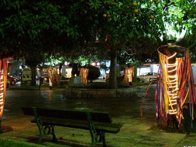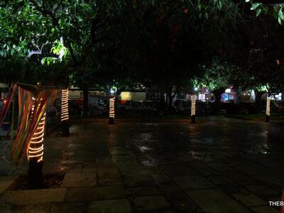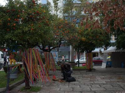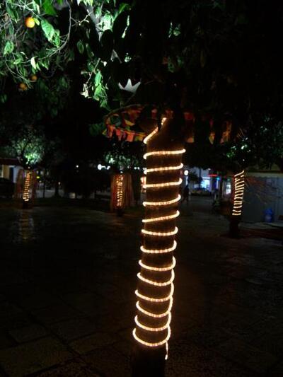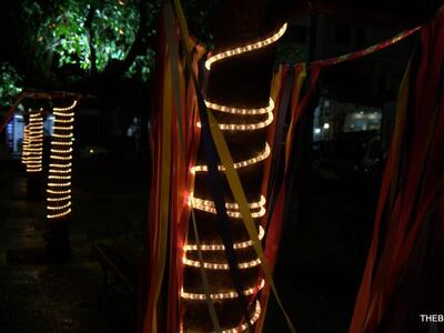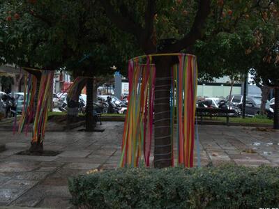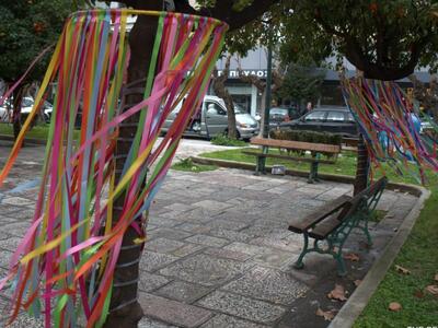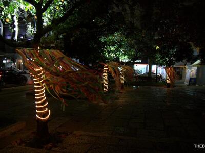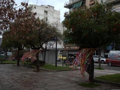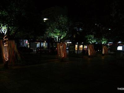 Με απλά, αλλά καλαίσθητα, στοιχεία (φωτεινούς έγχρωμους σωλήνες, κορδέλες και προβολείς) στόλισαν τους κορμούς των δέντρων και έδωσαν μια νότα χαράς στη σκοτεινή πλατεία τους.