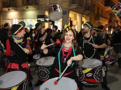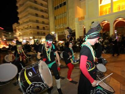 To συγκρότημα κρουστών έκανε πάταγο από νωρίς αφού περιόδευσε στους κεντρικούς δρόμους αναστατώνοντας την πόλη στους πεζόδρομους της Αγίου Νικολάου και της Ρήγα Φεραίου, στην πλατεία Γεωργίου Α΄, στις οδούς Ερμού, Μαιζώνος και Κορίνθου.