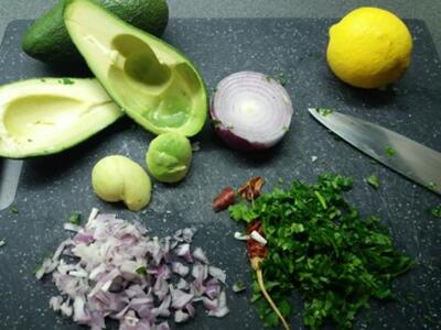 Κόβουμε στην μέση το αβοκάντο και πετάμε το κουκούτσι. Με ένα κουταλάκι ή το μικρό scoop, παίρνουμε την σάρκα του αβοκάντο. Κόβουμε τα κρεμμύδια σε μικρά κυβάκια, βγάζουμε τα σποράκια της πιπεριάς και την κόβουμε σε μικρά κομματάκια, ψιλοκόβουμε τα φύλλα του κόλιανδρου.