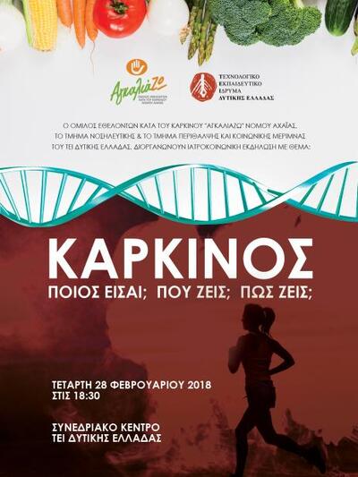Το Τμήμα Νοσηλευτικής της Σχολής ΣΕΥΠ, το Τμήμα Περίθαλψης και Κοινωνικής Μέριμνας του ΤΕΙ Δυτικής Ελλάδος κι ο Όμιλος Εθελοντών κατά του Καρκίνου «ΑγκαλιάΖΩ» Ν. Αχαΐας οργανώνουν, την Τετάρτη 28 Φεβρουαρίου 2018 και ώρα 18:30 στο Συνεδριακό Κέντρο του ΤΕΙ Δυτικής Ελλάδος, Ιατροκοινωνική Εκδήλωση με θέμα: