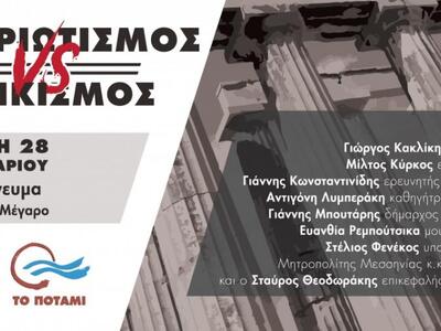 Mε θέμα «Πατριωτισμός VS Εθνικισμός» κι ένα πολυσυλλεκτικό πάνελ ομιλητών που περιλαμβάνει μεταξύ άλλων τον Δήμαρχο Θεσσαλονίκης Γιάννη Μπουτάρη, τον Μητροπολίτη Μεσσηνίας κ.κ. Χρυσόστομο, ο οποίος είχε ταχθεί κατά της διοργάνωσης συλλαλητηρίων για τη Μακεδονία και την μουσικό και βιολονίστρια με καταγωγή από την Κάτω Αχαΐα Ευανθία Ρεμπούτσικα, το «Ποτάμι» και ο Σταύρος Θεοδωράκης διοργανώνουν εκδήλωση – συζήτηση που θα συντονίσει η καθηγήτρια Αντιγόνη Λυμπεράκη.