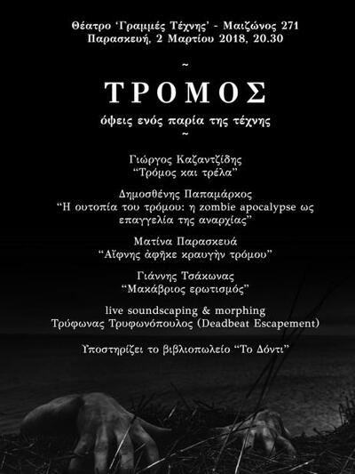 Εκδήλωση με θέμα «Τρόμος: Όψεις ενός παρία της τέχνης» θα πραγματοποιηθεί την Παρασκευή 2 Μαρτίου 2018, στις 20.30 το βράδυ στην Πάτρα, στο θέατρο «Γραμμές Τέχνης» στην Μαιζώνος 271, μετά την Παπαφλέσσα. Στην εκδήλωση θα γίνουν 4 τοποθετήσεις για τον τρόμο στη λογοτεχνία και την τέχνη γενικότερα που θα δώσουν το έναυσμα για μια συζήτηση γύρω από το πώς ο τρόμος μπορεί να είναι τόσο οικείος σε όλους μας.
