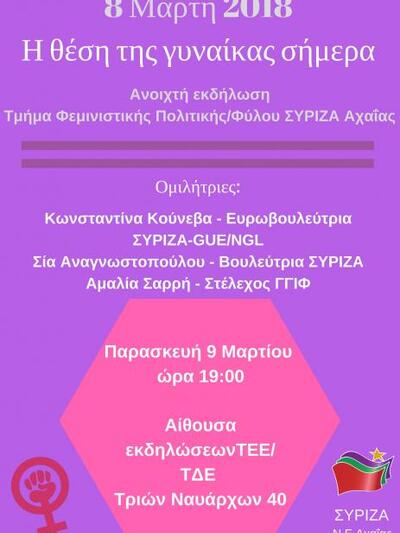Το Τμήμα Φεμινιστικής Πολιτικής /Φύλου του ΣΥΡΙΖΑ Αχαΐας τιμά την Παγκόσμια Ημέρα της Γυναίκας και διοργανώνει ανοιχτή εκδήλωση με θέμα: «8 Μάρτη 2018- Η θέση της γυναίκας σήμερα». Θα πραγματοποιηθεί την Παρασκευή 9 Μαρτίου και ώρα 7:00 μμ. στην αίθουσα εκδηλώσεων του ΤΕΕ / ΤΔΕ,Τριών Ναυάρχων 40 στη Πάτρα.
