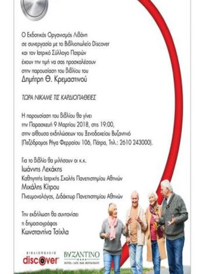 Με ένα νέο βιβλίο έρχεται στην Πάτρα ο διακεκριμένος καθηγητής καρδιολογίας Δημήτρης Κρεμαστινός. Πρόκειται για το βιβλίο «Τώρα νικάμε τις καρδιοπάθειες» το οποίο κυκλοφορεί από τις εκδόσεις Λιβάνη και θα παρουσιαστεί την παρασκευή 9 Μαρτίου στο ξενοδοχείο "Βυζαντινό"(πεζόδρομος Ρήγα Φεραίου).