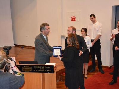 Εκ μέρους του Δ.Σ. η Ταμίας, διοικητική υπάλληλος του Πανεπιστημίου Πατρών και εκπρόσωπος στην Επιτροπή Πολιτιστικής Ανάπτυξης του Πανεπιστημίου κα Ευσταθία Ηλιοπούλου, απένειμε αναμνηστική πλακέτα στον έως πρότινως πρόεδρο κ. Γρηγόριο Φαρμακόπουλο για την επί 20ετή και πλέον συνεχή, ολόψυχη και ανιδιοτελή προσφορά του στον Πανεπιστημιακό Πολιτισμό και στην Παράδοση του τόπου μας.