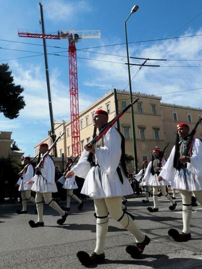 Αυτός ο τεράστιος γερανός βρίσκεται από την Κυριακή, έξω από το κτίριο του ελληνικού κοινοβουλίου, τραβώντας τα βλέμματα των περαστικών, αλλά και του φωτογράφου του Αθηναϊκού Πρακτορείου Ειδήσεων. Ο γερανός τοποθετήθηκε στο σημείο, εξαιτίας των εργασιών αποκατάστασης του στεγάστρου της ολομέλειας της Βουλής, το οποίο υπέστη ζημιές από τις πρόσφατες έντονες βροχοπτώσεις.