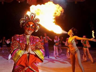 Η παράσταση Aladdin on Ice βρίθει από μαγικά νούμερα, ακροβατικά που κόβουν την ανάσα, σύγχρονη, εμπνευσμένη μουσική και υψηλής ποιότητας καλλιτεχνικού πατινάζ, σ’ ένα ονειρεμένο σκηνικό που αντανακλά την μαγευτική ατμόσφαιρα της Μέσης Ανατολής.