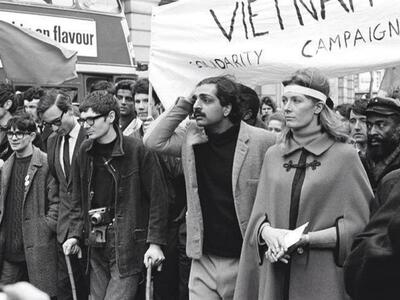 O Stephen Hawking (με τα γυαλιά και τα μπαστουνάκια), μαζί με τον Tariq Ali και την Vanessa Redgrave σε διαδήλωση κατά του πολέμου στο Βιετνάμ το 1968