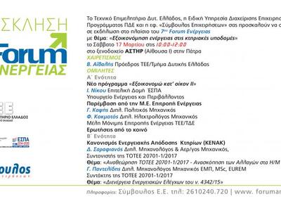 Στα πλαίσια του 7ου Forum Ενέργειας που θα διεξαχθεί 16 &17 Μαρτίου 2018 στο Ξενοδοχείο ΑΣΤΗΡ πραγματοποιείται εκδήλωση με θέμα «Εξοικονόμηση ενέργειας στις κτηριακές υποδομές», στην οποία θα αποτελέσει αντικείμενο ευρείας συζήτησης το νέο πρόγραμμα «Εξοικονομώ κατ’ οίκον ΙΙ» αλλά και ο Κανονισμός Ενεργειακής Απόδοσης Κτηρίων.