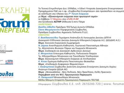 Στα πλαίσια του 7ου Forum Ενέργειας που θα διεξαχθεί 16 &17 Μαρτίου 2018 στο Ξενοδοχείο ΑΣΤΗΡ πραγματοποιείται εκδήλωση με θέμα «Εξοικονόμηση ενέργειας στον πρωτογενή τομέα», το Σαββατο 17 Μαρτιου από τις 12:00-14:00.