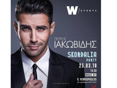 Το γοητευτικό ερμηνευτή και τραγουδοποιό Πέτρο Ιακωβίδη, περιζήτητο την τελευταία τριετία στη νυχτερινή Αθήνα, θα καλωσορίσει στο W Events της παραλιακής του Ρίου την ερχόμενη Κυριακή, 25 Μαρτίου, ανήμερα του εορτασμού της εθνικής επετείου, ο αγαπητός party expert και event planner Χάρης Παναγόπουλος. Oπως μάθαμε, ο Πέτρος θα είναι ο guest star του καθιερωμένου πλέον Skordalia Party που θα ξεκινήσει μετά τις 6 μ.μ. συγκεντρώνοντας πολύ και γνωστό κόσμο.