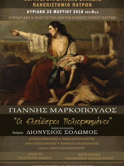 Μια συναυλία, με ελεύθερη είσοδο, για τον εορτασμό της Εθνικής Παλιγγενεσίας συνδιοργανώνουν η Περιφέρεια Δυτικής Ελλάδας και το Πανεπιστήμιο Πατρών με το έργο του κορυφαίου συνθέτη Γιάννη Μαρκόπουλου: «Οι Ελεύθεροι Πολιορκημένοι» - Κοσμική Λειτουργία σε ποίηση Διονυσίου Σολωμού, την Κυριακή 25 Μαρτίου 2018 και ώρα 20.00, στην κεντρική αίθουσα του Συνεδριακού και Πολιτιστικού Κέντρου του Πανεπιστημίου Πατρών.