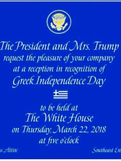 «Ο Πρόεδρος και η κυρία Τραμπ ζητούν με ευχαρίστηση την παρέα σας σε μία δεξίωση σχετικά με την Ημέρα Ανεξαρτησίας της Ελλάδας. Θα πραγματοποιηθεί στον Λευκό Οίκο την Πέμπτη, 22 Μαρτίου και ώρα 5», σημειώνεται στην πρόσκληση.