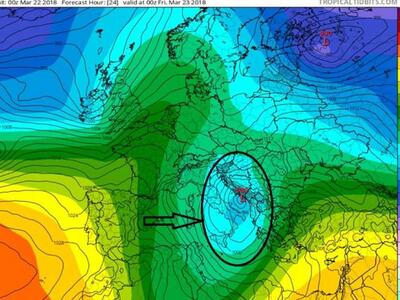 Σύμφωνα με την πρόγνωση του ερασιτέχνη μετεωρολόγου Νικόλα Σερέτη, το χαμηλό βαρομετρικό θα έχει ως αποτέλεσμα την εκδήλωση ισχυρών βροχών και σποραδικών καταιγίδων σε μεγάλο μέρος της δυτικής και βόρειας χώρας καθώς και στα νησιά του ανατολικού Αιγαίου κατά την διάρκεια της σημερινής και της αυριανής ημέρας.