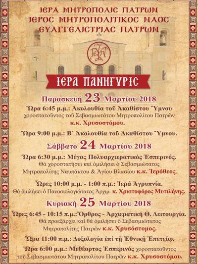 Στο μεταξύ πανηγυρίζει με λαμπρότητα ο ναός της Ευαγγελίστριας το σαββατοκύριακο 24 και 25 Μαρτίου. Το Σάββατο το απόγευμα στις 18.30 θα τελεστεί πανηγυρικός εσπερινός μετ’ αρτοκλασίας όπου θα παραστεί και θα χοροστατήσει ο σεβασμιότατος Μητροπολίτης Ναυπάκτου και Αγίου Βλασίου κ.κ. Ιερόθεος, ο οποίος θα κηρύξει και το Θείο λόγο. Θα ακολουθήσει στις 22.00 το βράδυ ιερά αγρυπνία όπου θα ιερουργήσει και θα μιλήσει ο αρχιμανδρίτης π. Χριστοφόρος Μυτιλήνης ενώ ανήμερα την Κυριακή 25 Μαρτίου που τιμάται η εορτή του Ευαγγελισμού της Θεοτόκου, στην πρωινή αρχιερατική Θεία λειτουργία θα χοροστατήσει ο σεβασμιότατος Μητροπολίτης Πατρών κ.κ. Χρυσόστομος.