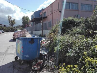 Σε πρώτο πλάνο στις φωτογραφίες που ακολουθούν η στοίβα από τα σκουπίδια που έχουν γεμίσει το χώρο στην οδό Ετεοκλέους στα Ζαρουχλέικα της Πάτρας. Σε δεύτερο πλάνο το 10ο γυμνάσιο που στεγάζεται στο κτίριο ακριβώς από πίσω.