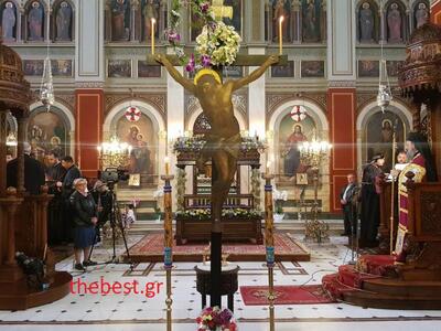 Πιστοί προσκυνούν τον επιτάφιο, περνώντας κάτω από το κουβούκλιο γονατιστοί, τρεις φορές σταυρωτά «για ευλογία».