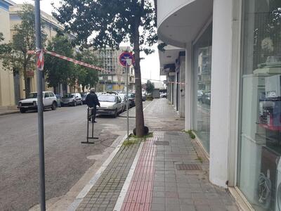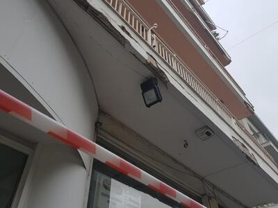 Στην πολυκατοικία που βρίσκεται στη συμβολή των οδώ είναι εμφανή τα σημάδια από την αποκόλληση σοβάδων.