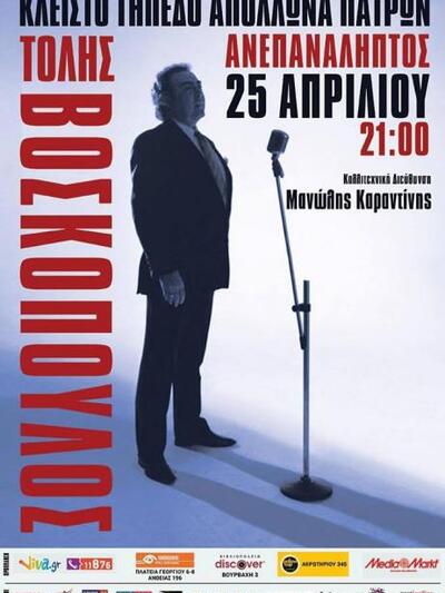 Την Τετάρτη 25 Απριλίου στις 9.00 το βράδυ ο Τόλης Βοσκόπουλος θα βρεθεί στην Πάτρα για μια μοναδική συναυλία. Η συναυλία θα λάβει χώρα στο Κλειστό Γήπεδο Απόλλωνα.