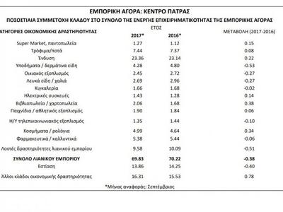 Μία μικρή μείωση των λουκέτων στην αγορά της Πάτρας παρατηρείται το τελευταίο εξάμηνο (Σεπτέμβριος του 2017 ως Μάρτιο του 2018), σύμφωνα με έρευνα του ΙΝΕΜΥ της ΕΣΕΕ. Μία αποτύπωση στις μεταβολές που συντελούνται στη δομή και τη σύνθεση της επιχειρηματικότητας κατά τη διάρκεια της οικονομικής κρίσης κάνει με την έρευνα του το INEMY της Εθνικής Συνομοσπονδίας Ελληνικού Εμπορίου.