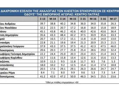 Στον παρακάτω πίνακα παρουσιάζεται η διαχρονική εξέλιξη της αναλογίας των κλειστών επιχειρήσεων σε κεντρικές οδούς της εμπορικής αγοράς, στο κέντρο της Πάτρας.