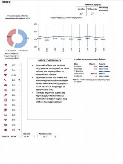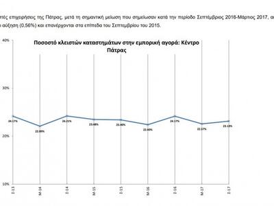 Οι κλειστές επιχειρήσεις της Πάτρας, μετά τη σημαντική μείωση που σημείωσαν κατά την περίοδο Σεπτέμβριος 2016-Μάρτιος 2017, ακολουθούν και πάλι αύξηση (0,56%) και επανέρχονται στα επίπεδα στου Σεπτεμβρίου του 2015.