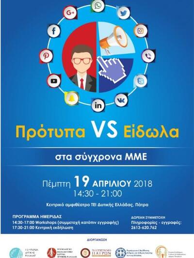 Ημερίδα με τίτλο «Πρότυπα Vs είδωλα στα σύγχρονα ΜΜΕ» διοργανώνει η Περιφέρεια Δυτικής Ελλάδας σε συνεργασία με τα ΤΕΙ Δυτικής Ελλάδος, το ΑΕΙ Πάτρας, την εφημερίδα ΠΕΛΟΠΟΝΝΗΣΟΣ, την Περιφερειακή Διεύθυνση Α’βάθμιας και Β’βάθμιας Εκπαίδευσης Δυτικής Ελλάδας και την Ένωση Συλλόγων Γονέων και Κηδεμόνων του Δήμου Πάτρας.